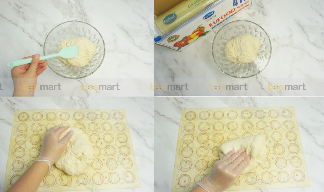 - Đậy màng bọc thực phẩm và để bột nghỉ trong khoảng 15 phút rồi mới đi nhào bột