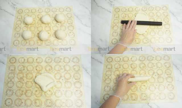 - Dùng cây lăn bột cán mỏng phần bột rồi cuộn 2 mép của miếng bột lại, tiếp dùng dùng cây lăn bột cán mỏng bột và cuộn lại theo hình trụ