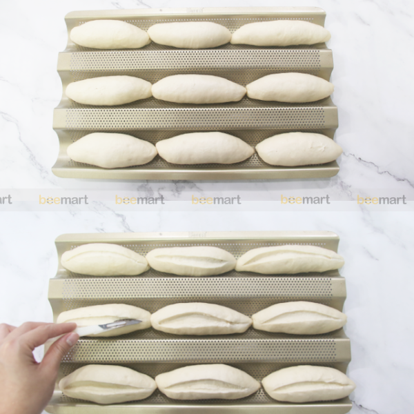 - Khi bánh đã nở gấp đôi, dùng dao rạch bánh hoặc dùng lưỡi lam rạch 1 đường dài dọc thân bánh