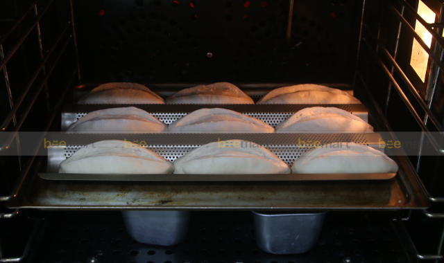 - Để có được vỏ bánh mì giòn, khi nướng cần đảm bảo 2 yếu tố: nhiệt độ nướng rất cao và trong lò có nhiều hơi nước. Vì vậy, trong khoảng 5-7 phút đầu nướng bánh, nhiệt độ nướng thường rất cao (từ 220 - 250 độ C). Độ ẩm khi nướng bánh cũng cần được duy trì trong khoảng ít nhất 1/2 thời gian nướng bánh. Nếu lò có sẵn chế độ phun sương hay xịt nước thì tốt nhưng nếu lò nhà bạn không có chức năng này, có thể để một cốc nước nóng hoặc khay nước nóng trong lò để tạo độ ẩm cho bánh