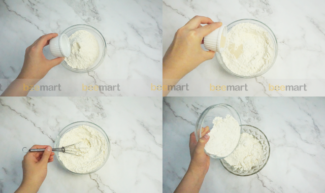 - Trộn hỗn hợp khô gồm: 300g bột mì, 20g đường, 5g men và 2g muối. Lưu ý đổ muối và men cách xa nhau để tránh làm chết men