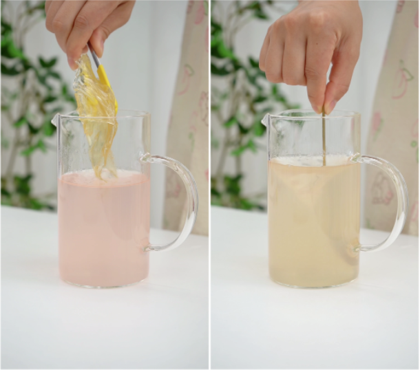 Dùng 350ml nước đào để nước còn ấm thì cho 8g gelatine vào khuấy đều, để ngăn mát trong quá trình trang trí miếng đào
