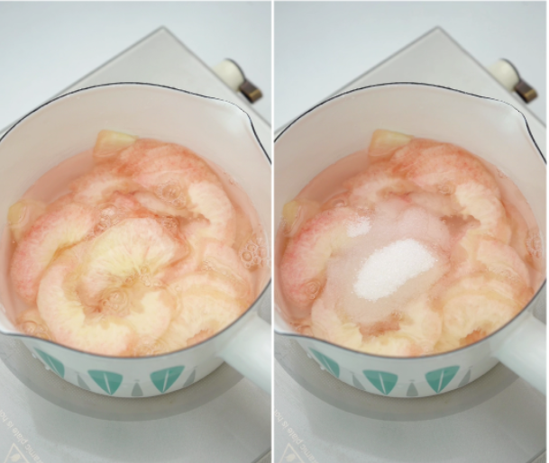 Quả đào gọt vỏ, thái lát từng miếng , thêm 500ml nước sách và đường nấu chín cho đến khi đào lát mềm.