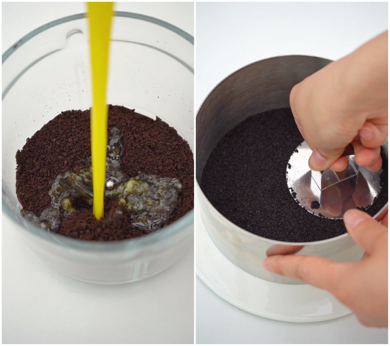 Nghiền nát 80 g đế bánh oreo, đun chảy 40g bơ rồi trộn cùng bánh