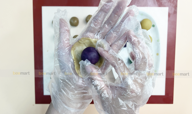 - Đặt nhân bánh vào giữa, nhẹ nhàng miết bột làm sao cho vỏ bao kín nhân, tránh lộ nhân ra ngoài