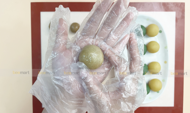- Chia 80g nhân đậu xanh thành 4 phần bằng nhau, làm tương tự với nhân hạt sen trà xanh và nhân khoai môn sau đó vo tròn lại