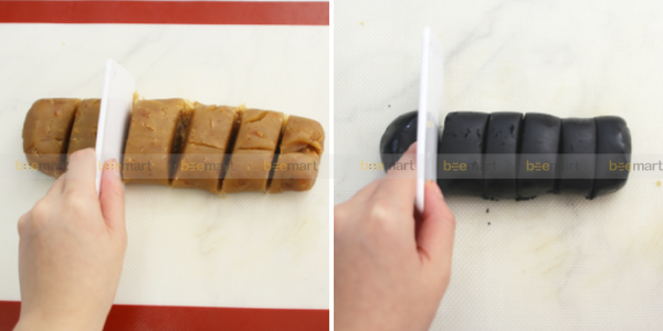 Với phần bột vỏ bánh, sau khi bột đã nghỉ đủ thời gian, tiến hành nhồi qua bột đến khi được 1 khối dẻo mịn, không dính tay. Chia bột thành 6 phần bằng nhau (50g/bánh).