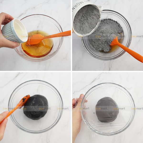 Trước tiên, bạn trộn đều 120g nước đường bánh nướng và 20g dầu ăn. Thêm tiếp vào tô 170g bột tinh than tre vào tô, trộn đều đến khi không còn bột khô là được nhé!