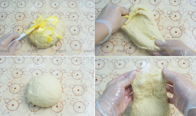 - Sau khi đã nhào bột mịn, thêm vào 40g bơ vào và nhanh tay nhồi bột đến khi bột và bơ hòa quyện và bột có thể kéo màng được (lưu ý bơ để mềm ở nhiệt độ phòng chứ không chảy)