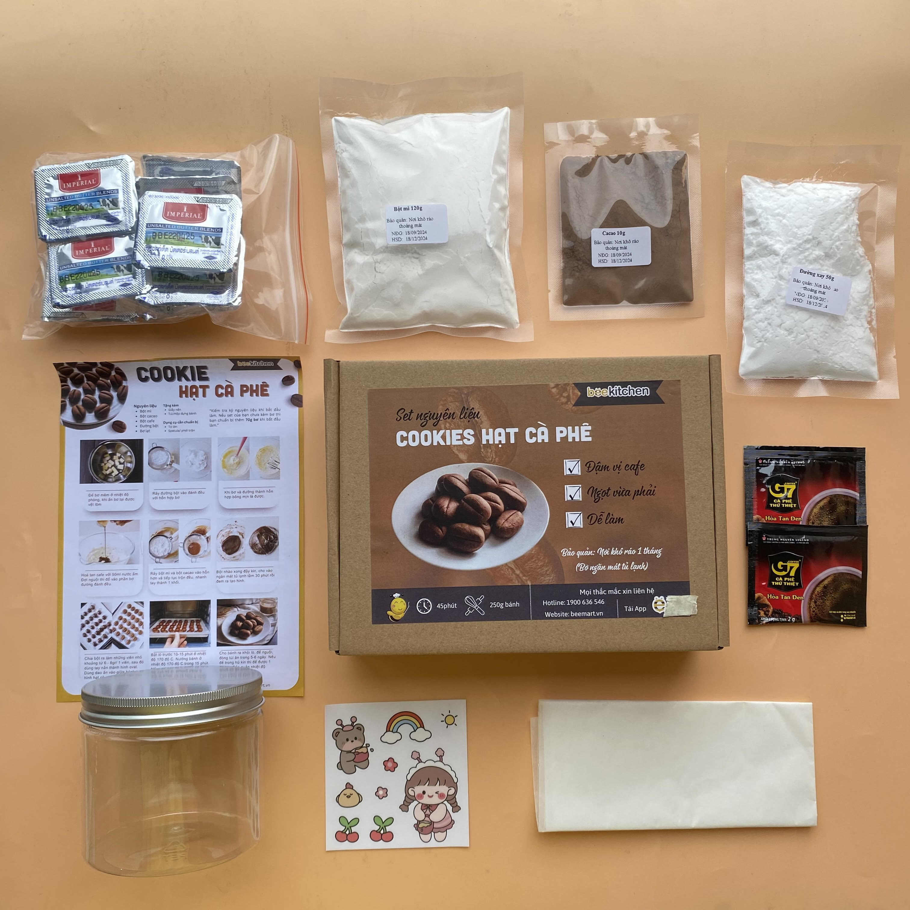Set DIY làm bánh quy hạt cà phê tại Beemart đã bao gồm ĐẦY ĐỦ NGUYÊN LIỆU gồm có: Bột mì, bơ lạt, đường, bột cacao, bột cafe, giấy nến