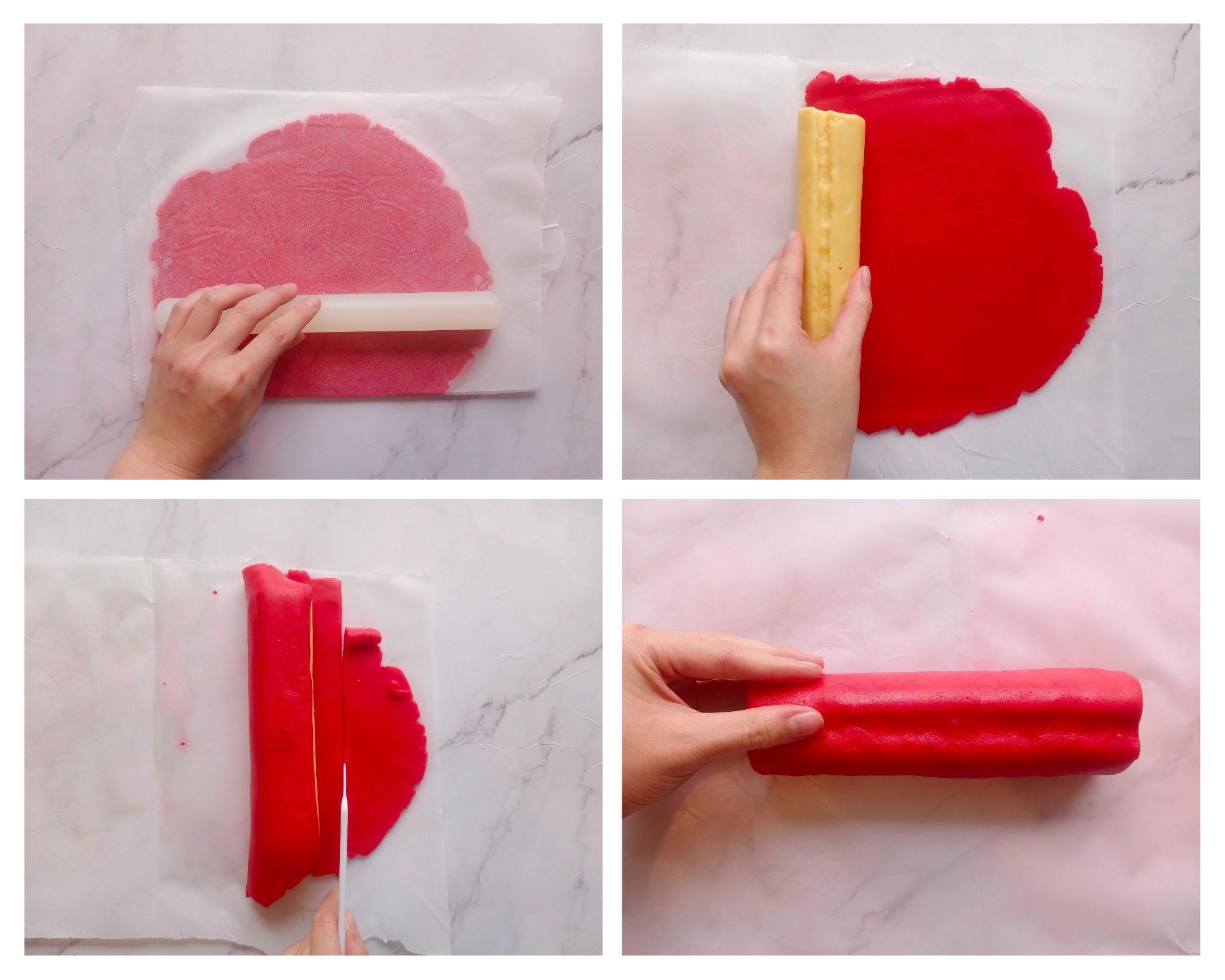 - Phần bột đỏ dùng giấy nến cán mỏng bột, sau đó bọc ngoài cục bột màu trắng sao cho phủ kín được hết lớp bột trắng