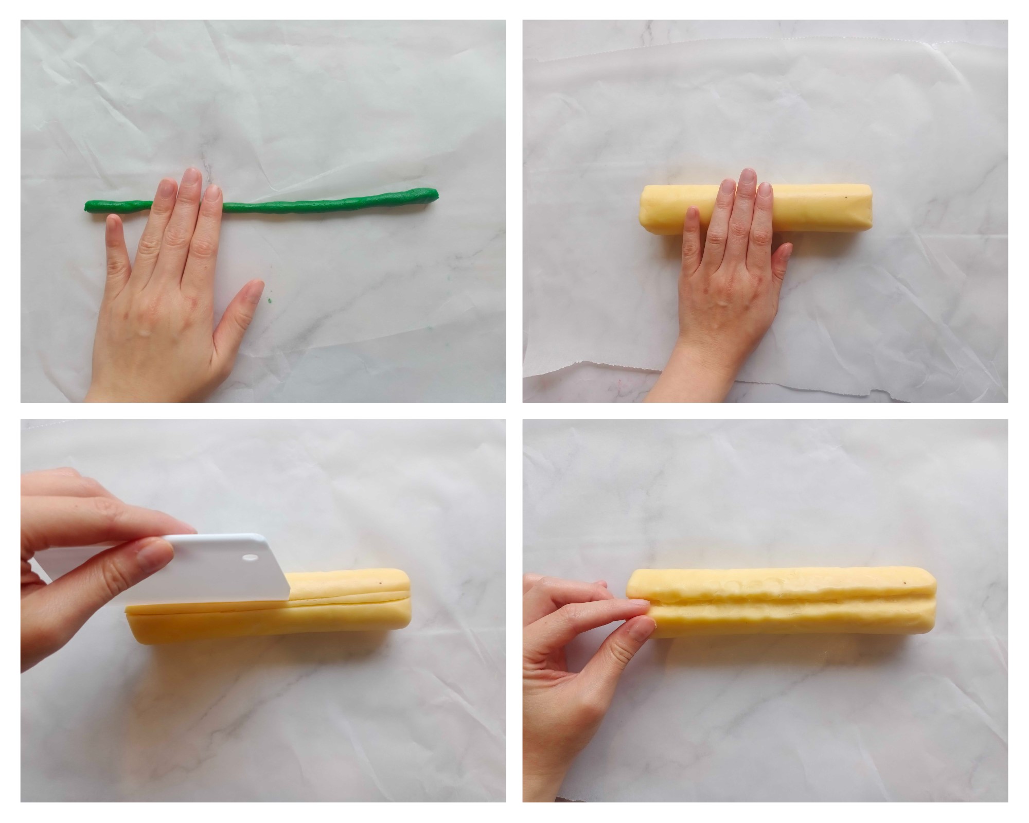- Lăn bột màu trắng thành hình trụ dài. Dùng dao hoặc miếng cắt cắt 1 dải nhỏ trên cục bột ở 2 đầu đối nhau tạo 2 hố lõm 2 đầu cục bột. Sau đó cho bột vào tủ lạnh 10 phút để bột cứng lại