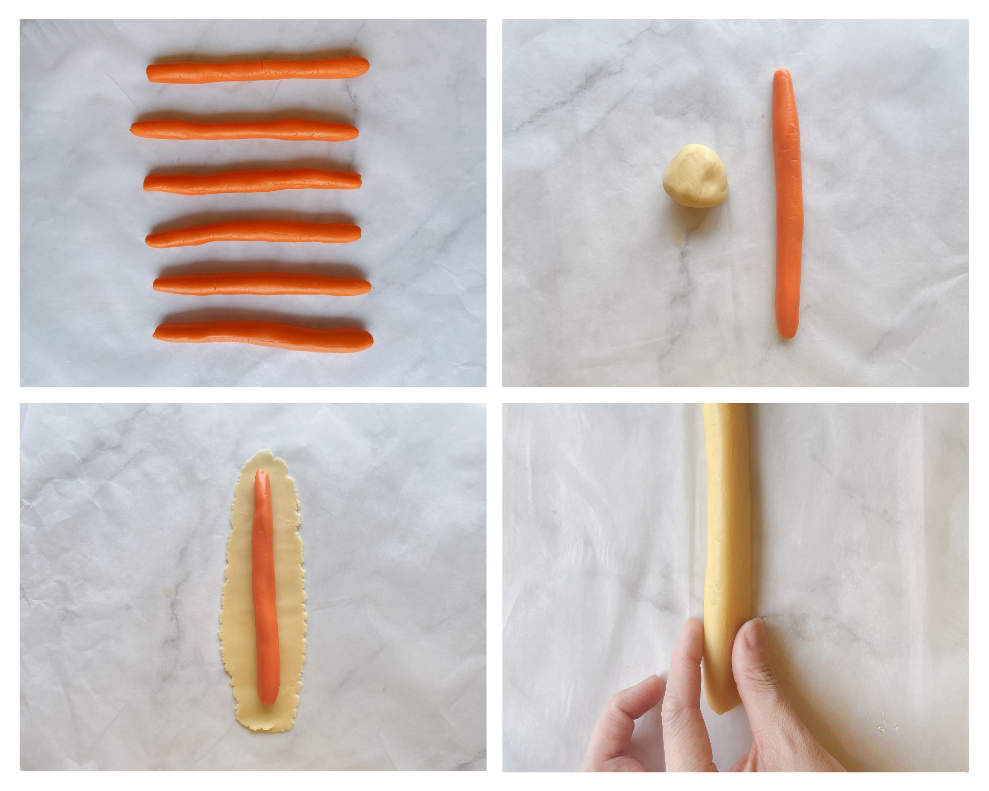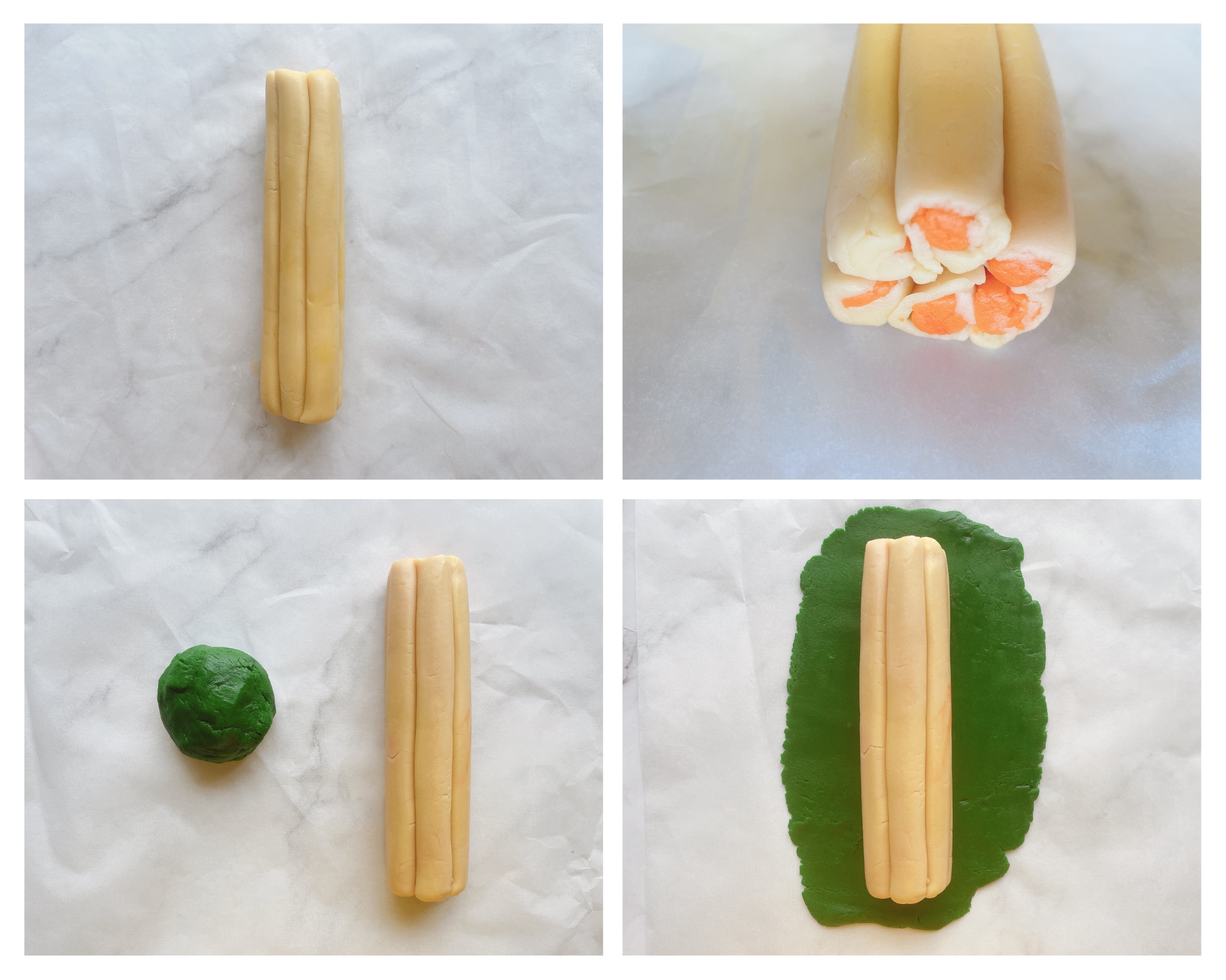 - Lấy 6 miếng bột màu trắng đã cán mỏng bán đầu để bọc kín bên ngoài 6 cục bột cam tam giác >> sau đó lăn tròn thành dải dài và ấn thành dải tam giác giống lõi vàng bên trong >>> cho vào tủ đông 15 phút để bột cứng lại.