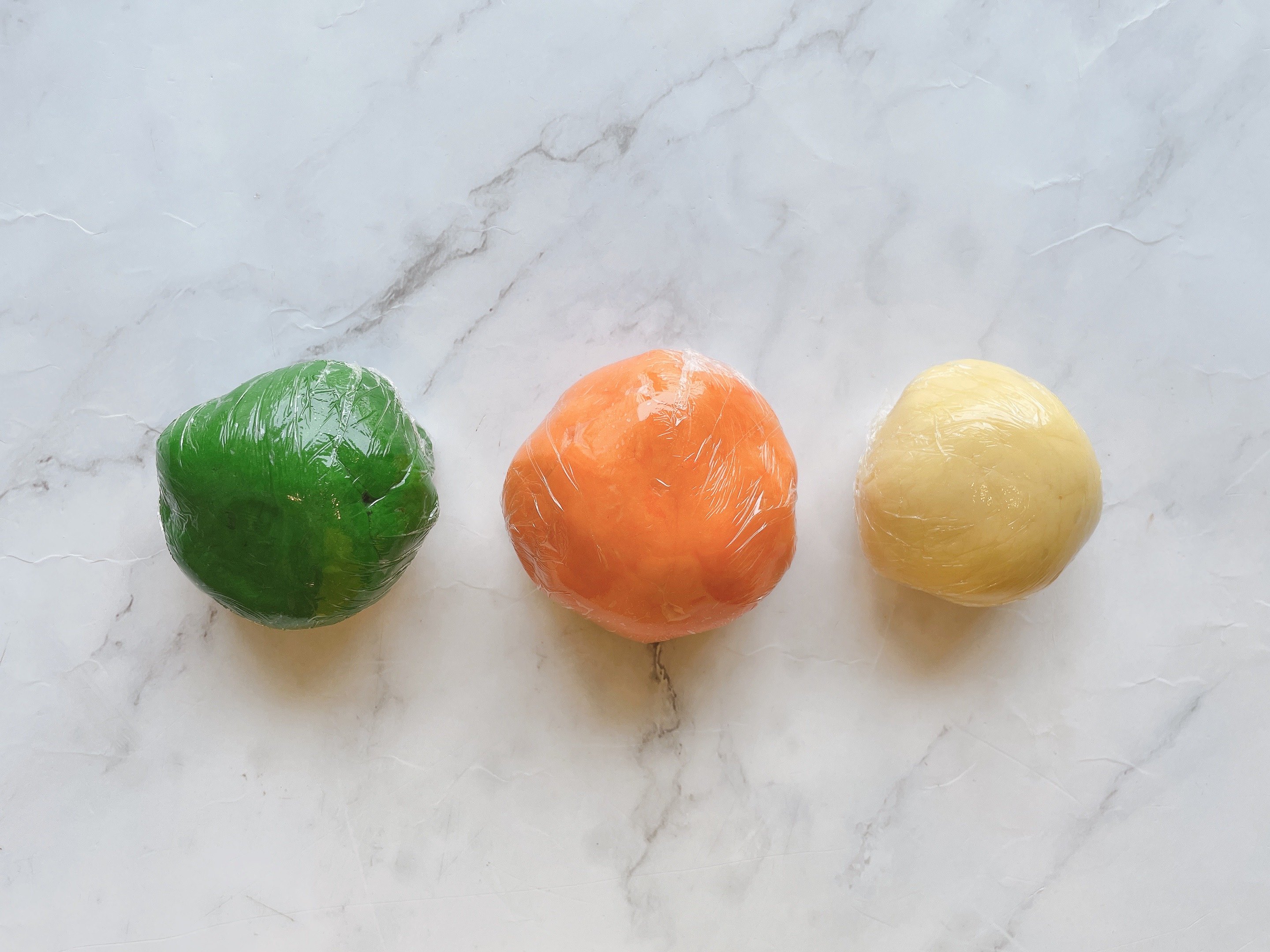 Chia khối bột màu cam thành 6 phần bằng nhau (30g/viên) => lăn thành như dải dài rồi ấn thành hình tam giác => thu được 6 dải tam giác có độ dài và đố lớn ngang nhau => đem cất tủ đông 10 phút cho bột cứng lại