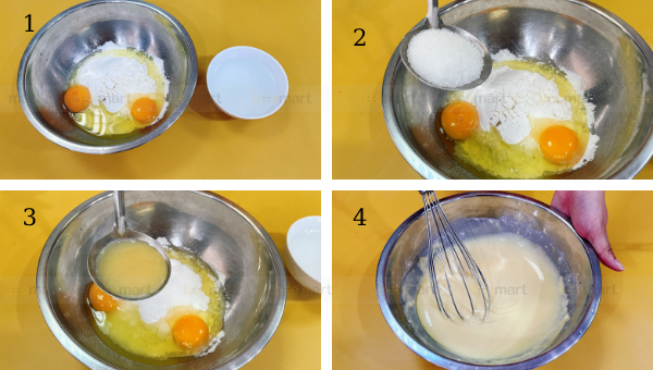 - Đầu tiên bạn cho bột mì vào tô sau đó thêm tiếp trứng, đường, sữa và nước vào và đánh đều đến khi hỗn hợp bột đặc sánh, không còn bột lợn cợn.