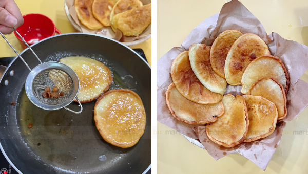 - Khi bạn thấy phần viền bánh bắt đầu vàng giòn là bạn có thể lật bánh để rán mặt còn lại. Bánh vàng đều hai mặt là chín rồi đó.