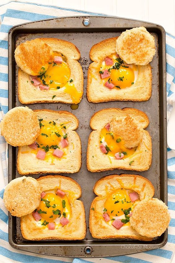 - Bước 2: Thái nhỏ các lát thịt nguội, đập trứng cho từng quả vào lỗ tròn của bánh mì, thêm thịt nguội, phô mai cheddar, quết bơ lên các mặt bánh rồi nướng trong 5 - 8 phút trong 130 - 150 độ C.