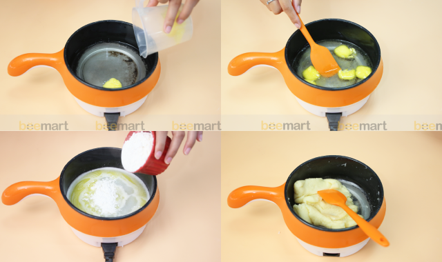 - Bật bếp ở lửa vừa, đun đến khi hỗn hợp sôi mạnh thì thêm 70g bột mì vào, nhanh tay đảo đều đến khi không còn thấy bột khô