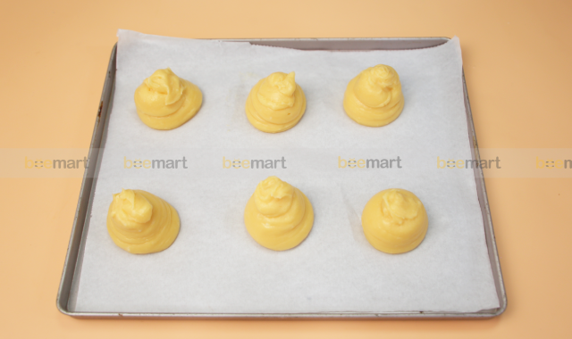 - Cắt đầu túi bắt kem, bóp bột vỏ bánh lên khay. Công thức này có thể làm được 6-8 bánh hoặc nhiều hơn tùy vào việc bắt vỏ bánh to hay nhỏ