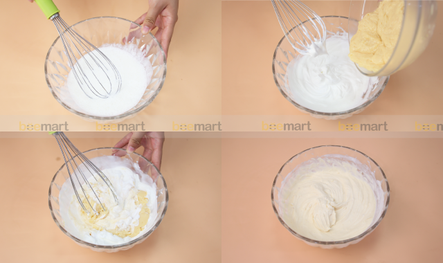 - Khi hỗn hợp kem trứng ở bước 1 đã nguội hoàn toàn thì trộn đều cùng 100ml whipping cream vừa đánh