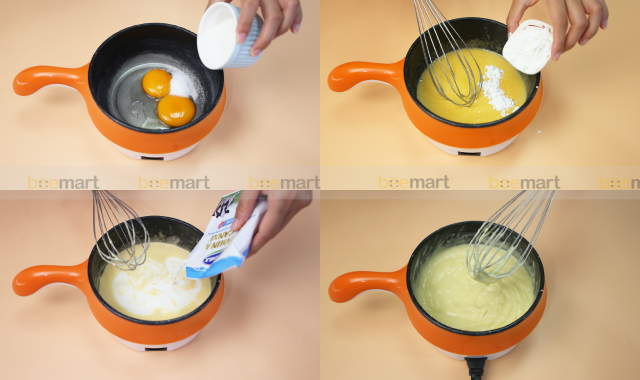 - Thêm 2 lòng đỏ trứng vào nồi cùng 60g đường, khuấy đều đến khi tan hết đường và hỗn hợp chuyển sang màu vàng nhạt