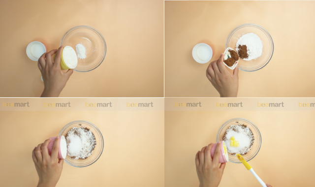 - Thêm 50g bột mì, 3g bột cacao và 50g đường kính vào tô rồi trộn đều