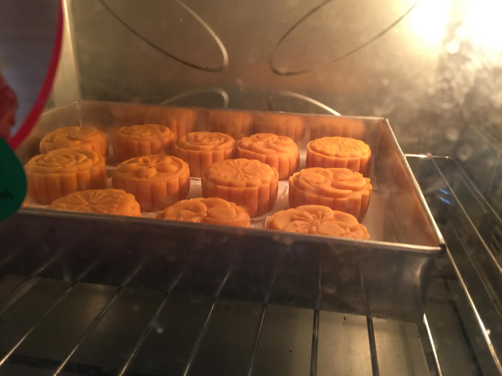 - Bánh cần mặt đỏ đều đẹp nên công thức làm bánh Trung thu gấc này không cần quét mặt bằng nước trứng nhé.