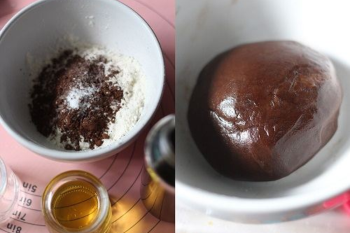 - Rây bột mì và bột ca-cao vào tô và trộn đều.