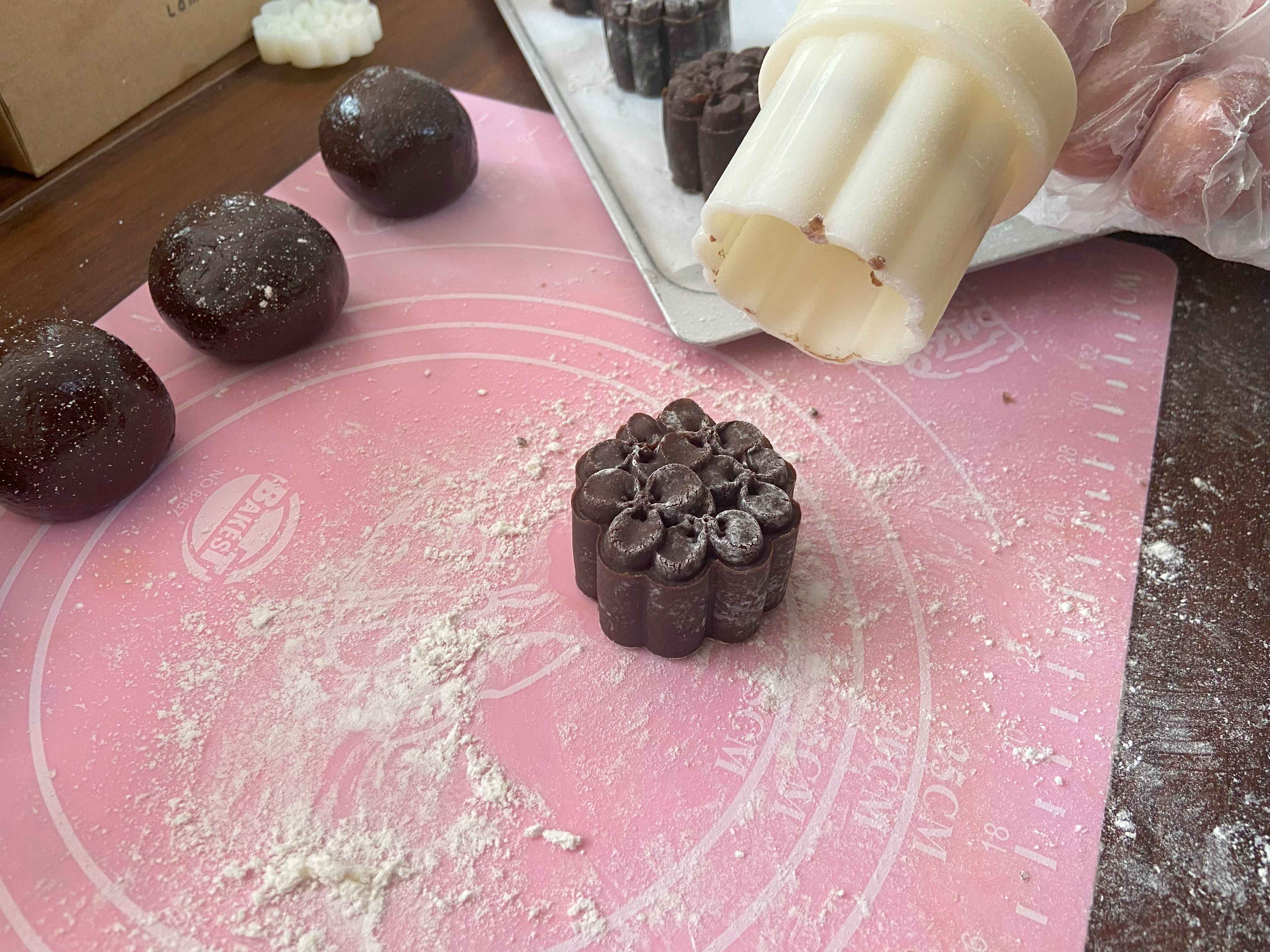 - Dùng bột mì để chống dính cho khuôn trước khi đóng. Lưu ý không để bột bám trên bề mặt và thành khuôn quá nhiều khiến đóng bánh không được nét.