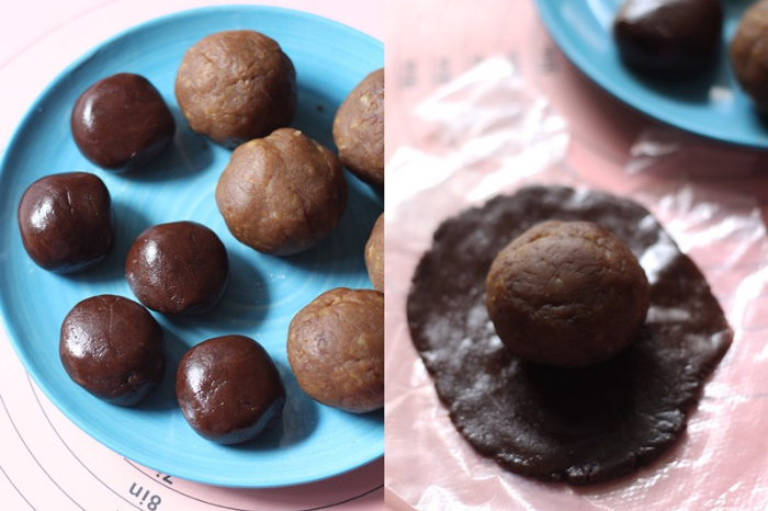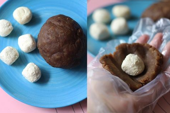 - Cho miếng vỏ bột lên lòng bàn tay, bên trên đặt một viên nhân rồi dùng má bàn tay từ từ “ôm” viên nhân, vừa ôm vừa xoay, nắm đều tay để phần vỏ bọc kín phần nhân.