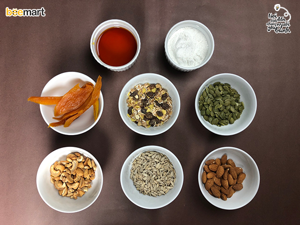 Bước 1: Bạn cắt nhỏ hoa quả sấy dẻo thành những miếng nhỏ. Các nguyên liệu hạt còn lại bạn dùng chày đập dập (nhưng không đập nhỏ nhuyễn nha)