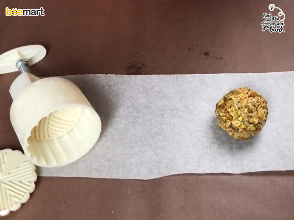 Bước 3: Chia thành 5 - 6 nhân ( mỗi nhân có trọng lượng 100g), vo tròn lại rồi dùng vỏ bánh bọc ra bên ngoài. Dùng khuôn tạo hình bánh rồi đem đi nướng.