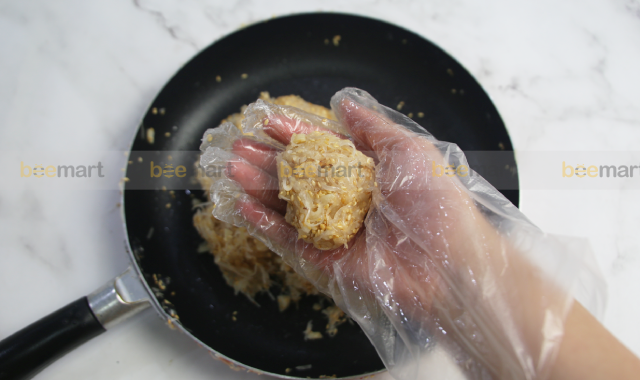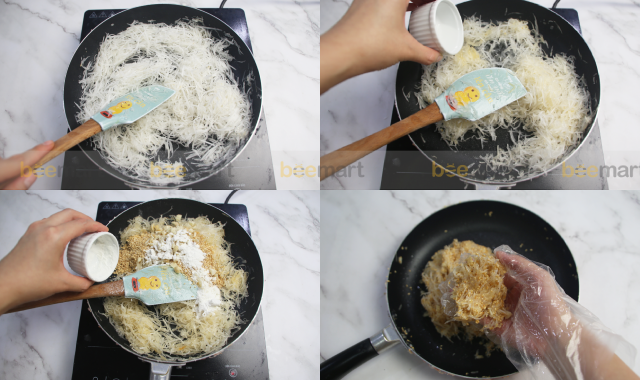 - Thêm 300g dừa nạo đã ngâm đường vào chảo