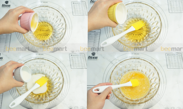 - Thêm lần lượt 80g mật ong, 60g dầu dừa, 40g sữa và 2 lòng đỏ trứng vào tô, trộn đều