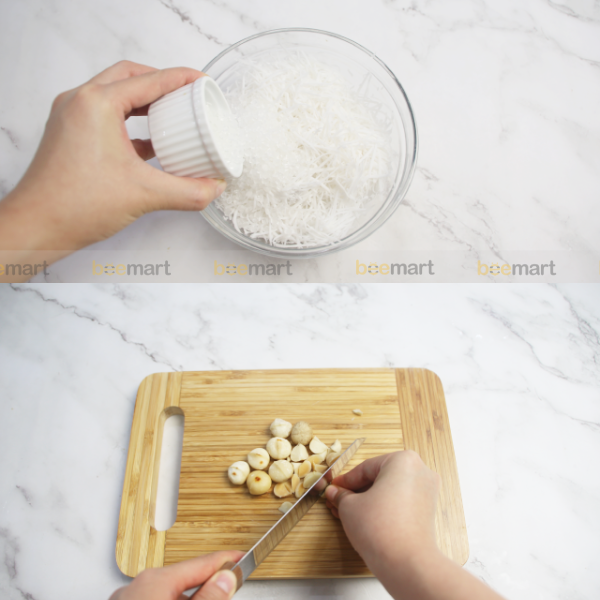 - Ngâm 300g dừa nạo với 150g đường phèn trong khoảng 1-2 tiếng cho dừa mềm hơn và ngấm đường