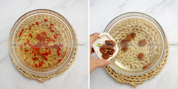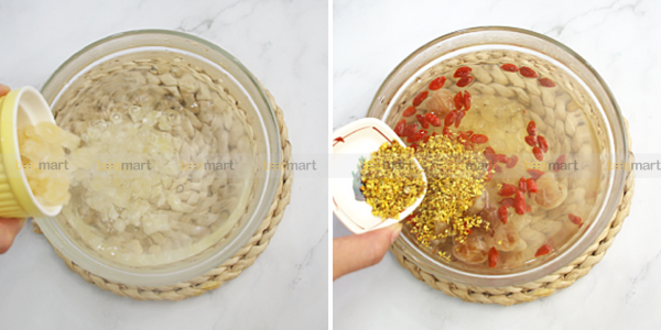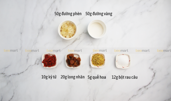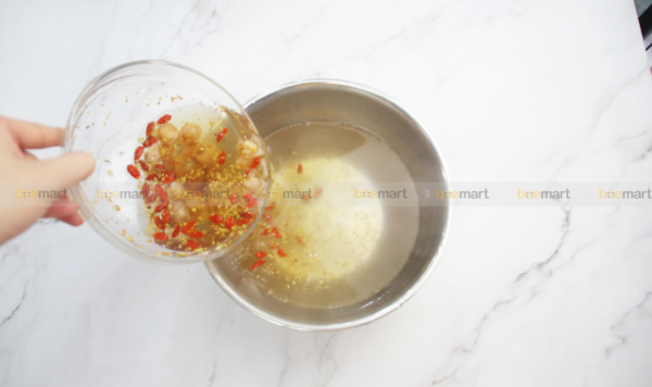 Bạn cần chuẩn bị 350ml nước nóng rồi hòa tan 50g đường phèn với nước nóng đó. Thêm 5g quế hoa, 10g kỷ tử và 20g long nhãn vào cùng nước đường, khuấy đều.