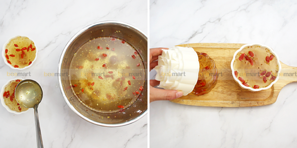 Sau đó, bạn đổ hỗn hợp thạch ra khuôn. Để thạch nguội bớt rồi cho vào ngăn mát tủ lạnh khoảng 1 tiếng rồi mới gỡ khuôn.