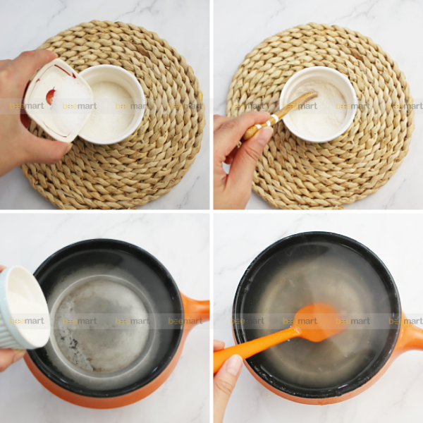 Bật bếp đun sôi 1L nước, đổ hỗn hợp bột thạch, đường trắng vào. Đun lửa nhỏ trong vòng 10-15 phút thì tắt bếp.