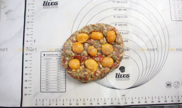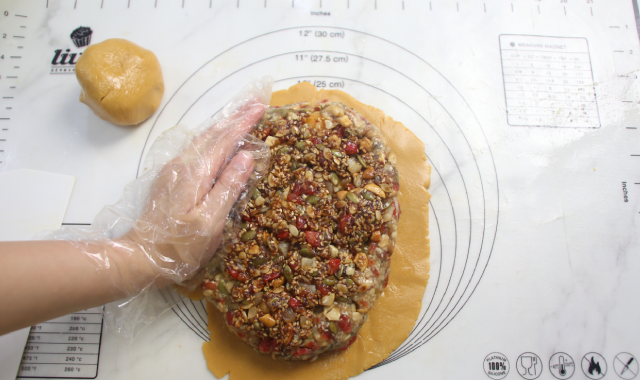 Tiếp theo, nhào sơ nhân thập cẩm cho nhân được mềm dẻo hơn rồi đặt trứng muối vào giữa, bọc kín lại. Với bánh có khối lượng to, việc bọc nhân sẽ khó hơn so với bánh nhỏ nên cần làm khéo léo hơn!