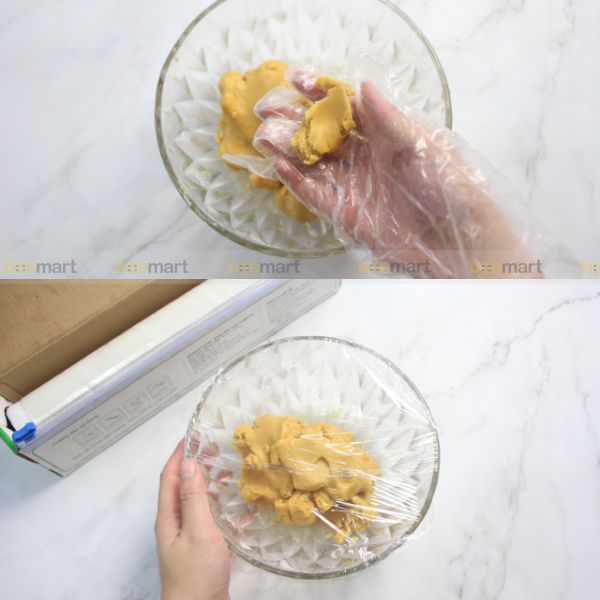 Sau khi trộn bột, đậy màng bọc thực phẩm và để bột nghỉ trong khoảng 30 phút