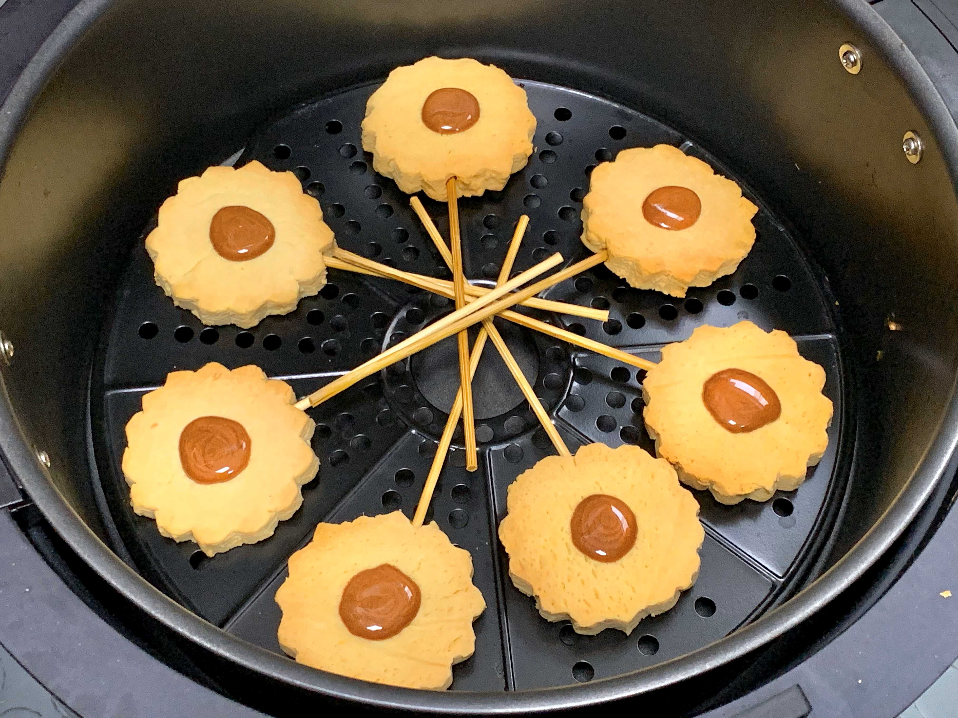 - Sau đó đem toàn bộ phần bánh đã vẽ sấy ở lò nướng hoặc nồi chiên không dầu ở nhiệt độ 80 độ C trong 5-7 phút để lớp đường vẽ đầu tiên được khô lại.