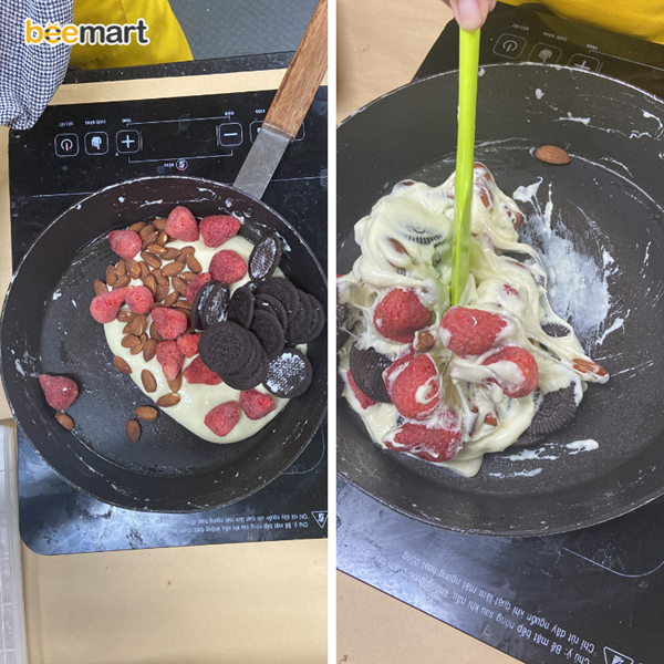 - Đổ lần lượt bánh oreo (giữ lại 2-3 miếng bánh để rắc lên thành phẩm), hạt hạnh nhân, dâu tây vào chảo. Trộn đều sao cho hỗn hợp kẹo dính đều lên phần nguyên liệu khô vừa thêm vào, tạo thành một khối thống nhất thì dừng lại (ở bước này bạn có thể dùng găng tay để trộn đều hỗn hợp).