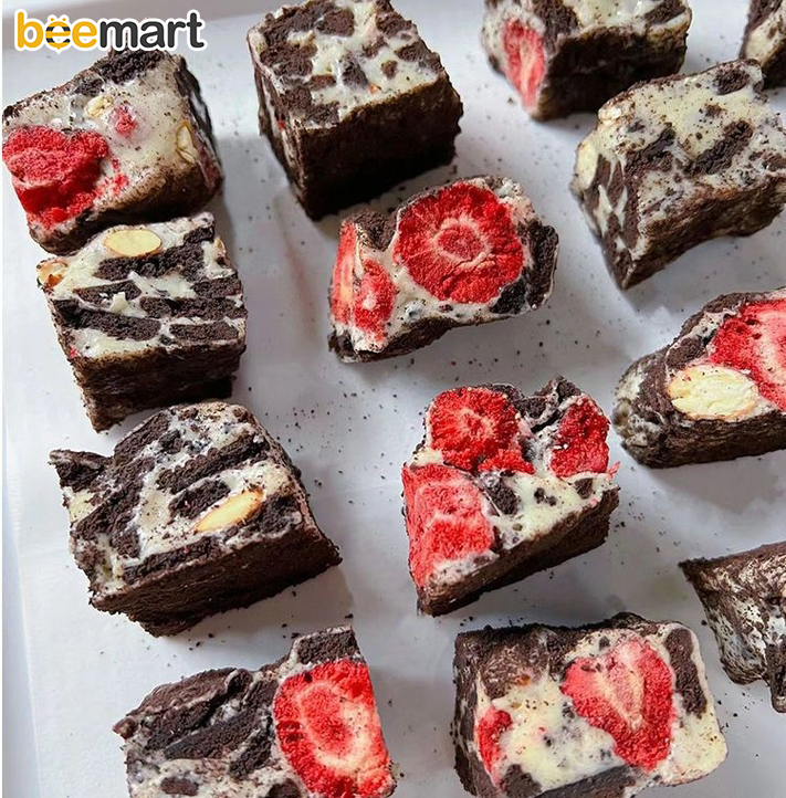Bánh Bông Tuyết là biến tấu của kẹo Nougat với sự kết hợp của lớp Nougat dai dai, cốt bánh quy xôm xốp điểm vị rất hài hòa, xen lẫn thêm chút hạt bùi bùi béo ngậy, mứt trái cây sấy lạnh chua ngọt tự nhiên phủ lên bề mặt bánh, làm đậm đà hơn cho lớp nền ngọt thơm. Ít đường, không quá ngọt, lạ miệng và đặc biệt không có chất bảo quản, chiếc bánh này sẽ được lũ trẻ thích mê. Hãy cùng Bee bắt tay làm món bánh này nhé.