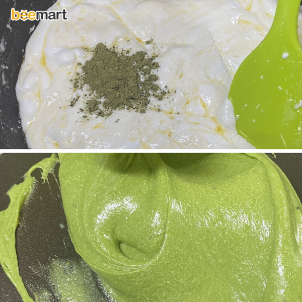 - Đổ bột sữa (giữ lại khoảng 5-10g cho bước hoàn thiện) và bột matcha vào hỗn hợp và tiếp tục khuấy liên tục đến khi bột sữa hòa quyện và tan gần hết vào bánh và dùng spatula trộn đều đến khi hỗn hợp quyện vào nhau rồi tắt bếp.