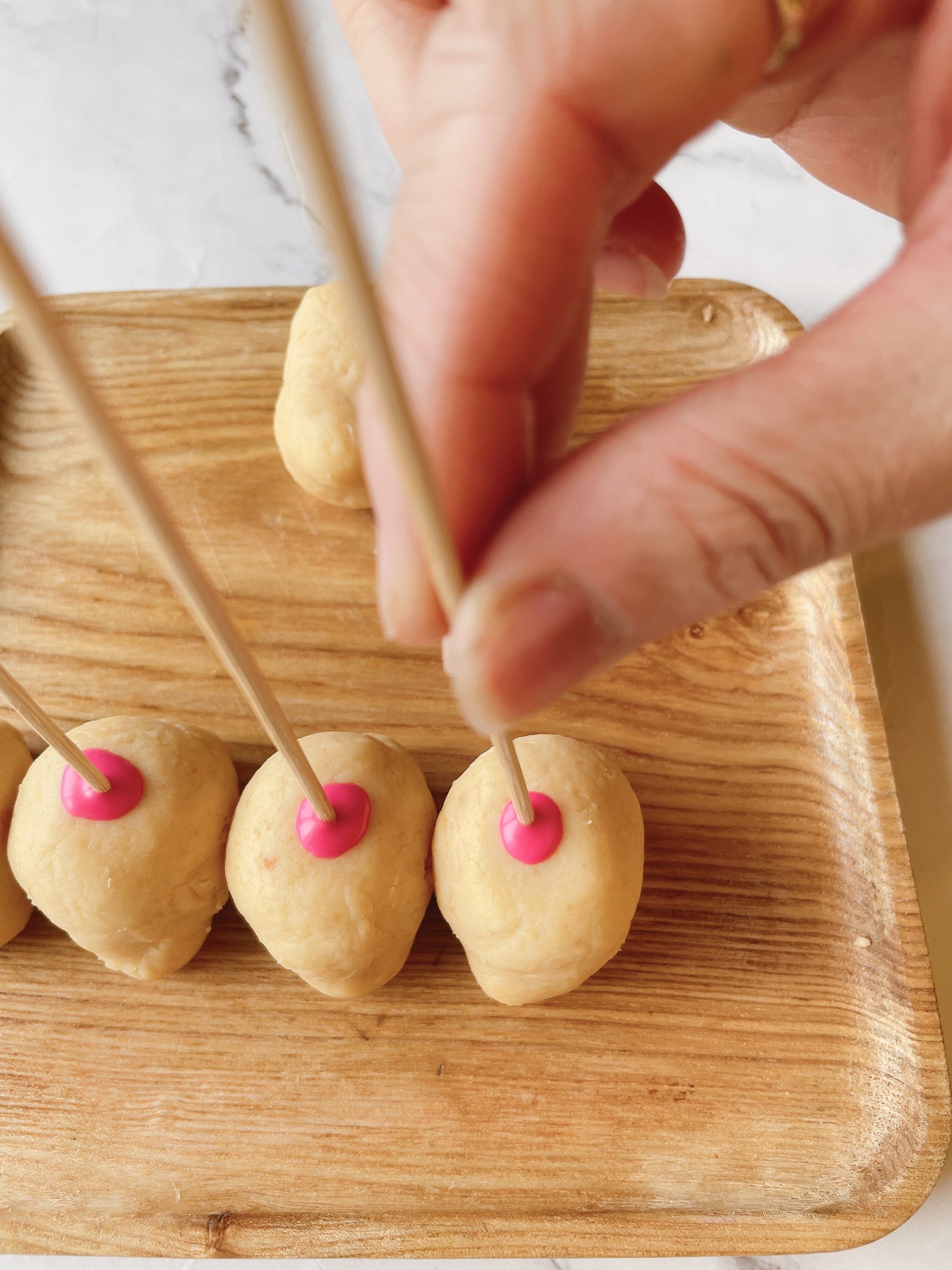 Lấy que tre nhúng 1 đầu vào túi socola rồi nhanh tay cắm vào viên bánh . Việc này sẽ giúp cố định viên bánh ở đầu que được chắn chắn.