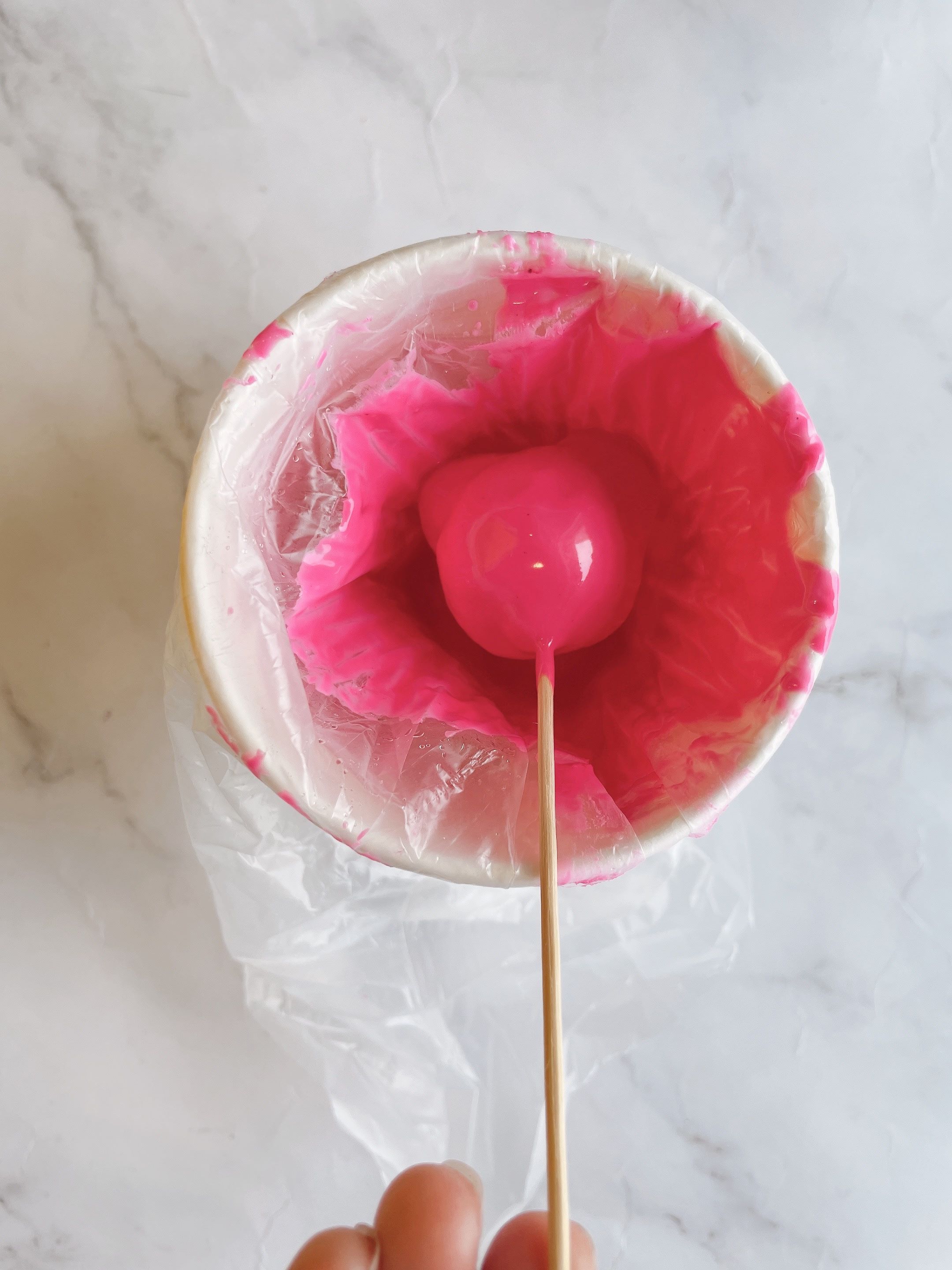 Khi bánh đã đứng vững trên đầu que, nhanh tay nhúng toàn bộ viên bánh xuống túi socola. Làm tương tự như vậy với tất cả các viên bánh còn lại.