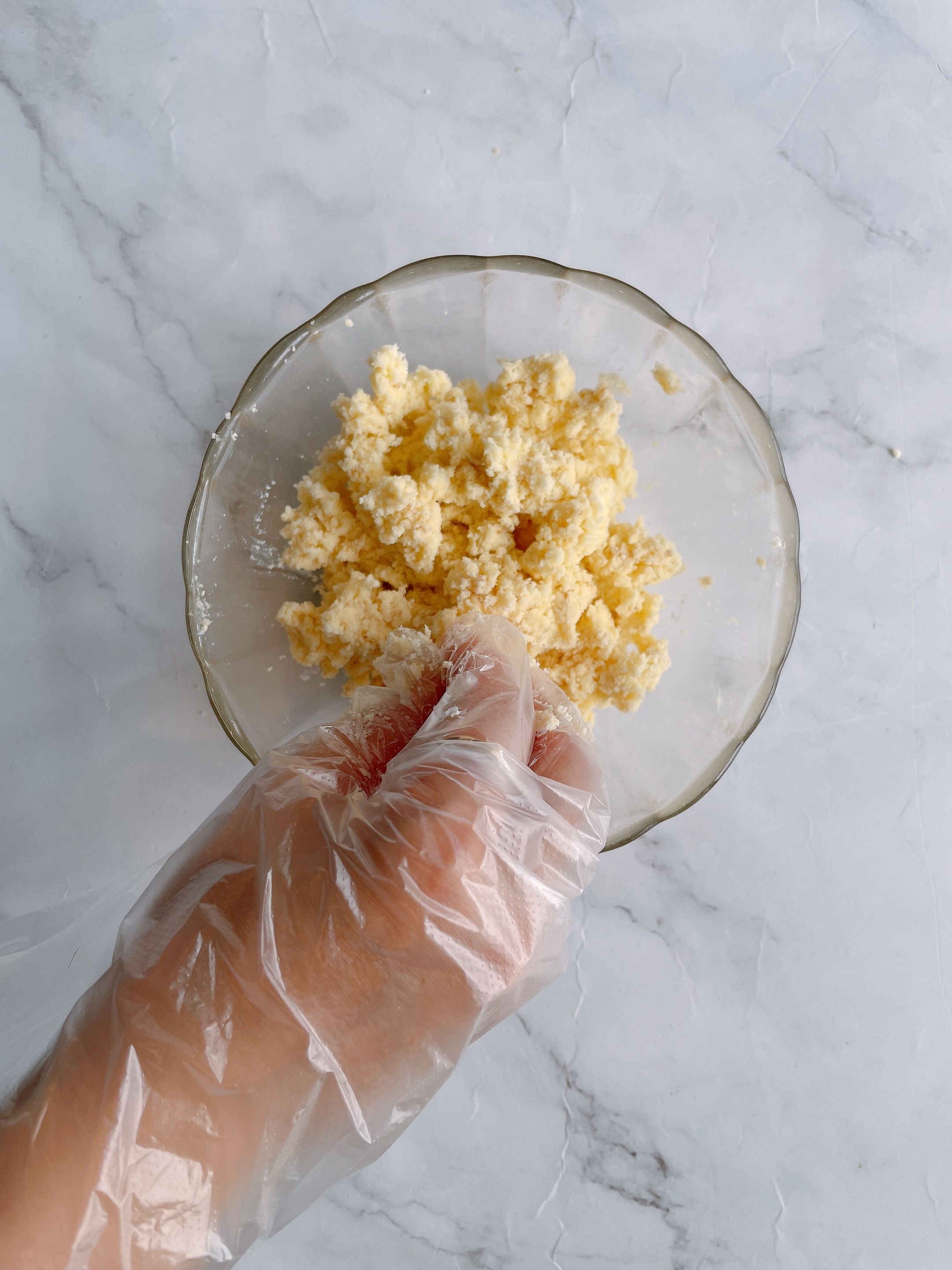 - Bóp vụn cốt bánh bông lan ra 1 chiếc bát sạch. Sau đó cho miếng phomai vào bóp tiếp tục cho tới khi thu được hỗn hợp cốt bánh mềm ướt.