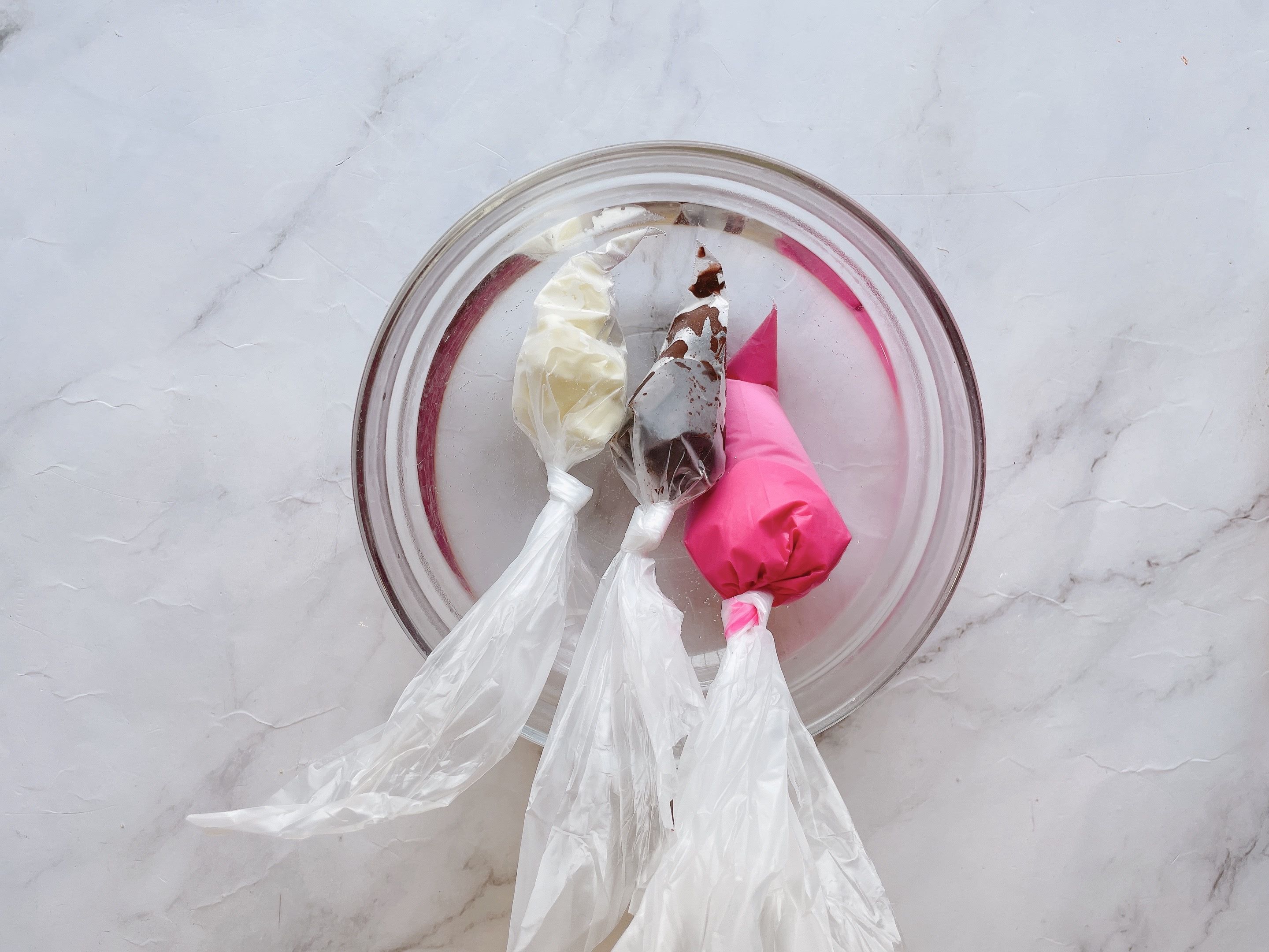 Chuẩn bị 1 tô nước nóng rồi ngâm 3 túi socola đã buộc kín vào trong 10 phút rồi dùng tay bóp đều để đảm bảo socola trong túi tan chảy hoàn toàn