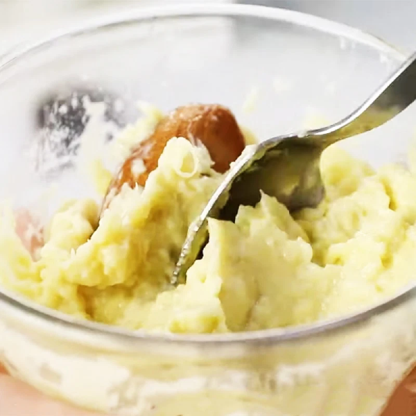 - Sầu riêng gỡ lấy phần thịt và dùng dĩa dằm nhuyễn, bạn cũng có thể xay sinh tố nhưng dằm bằng tay thì vị sầu sẽ rõ và đậm đà hơn.