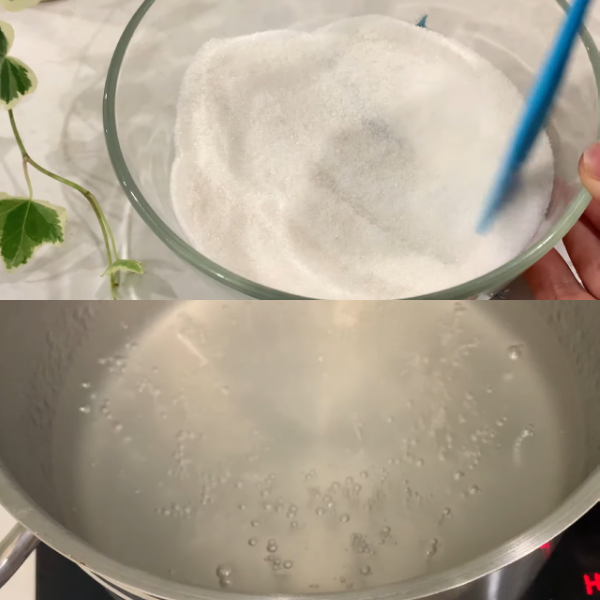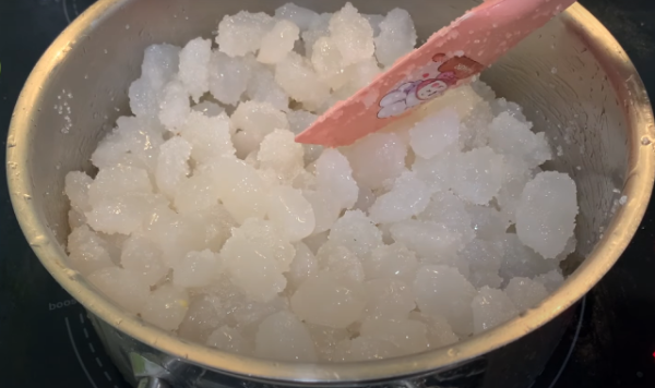 - Trộn 2 gói bột rau câu con cá với 20g đường. Chuẩn bị 2 lít nước lọc, đun sôi nước rồi từ từ cho bột rau câu + đường đã trộn vào nồi. Vừa đổ vừa khuấy đều để tránh bị vón cục. Sau khi đun sôi, bạn hạ lửa nhỏ, đun thêm khoảng 10 phút nữa thì thạch sẽ không bị vón cục hay chảy nước.